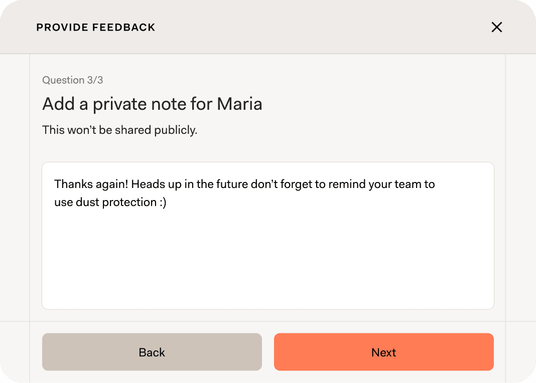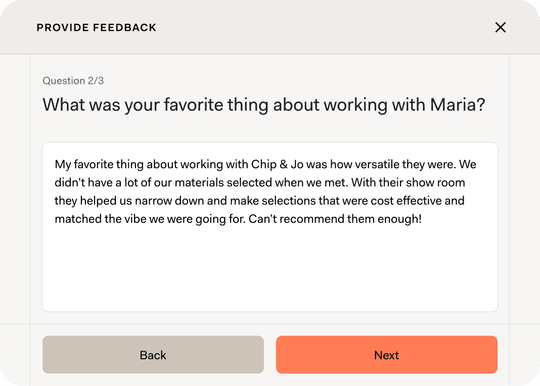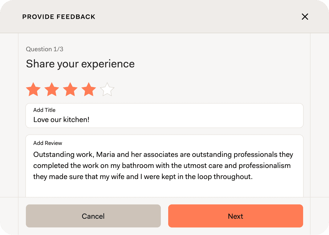 The existing review flow was thin. We redesigned it to ask better questions, capture more specific homeowner feedback, and anchor each review to a real completed project. Reviews were also updated to be synthesized with AI for a quick read on contractor performance.