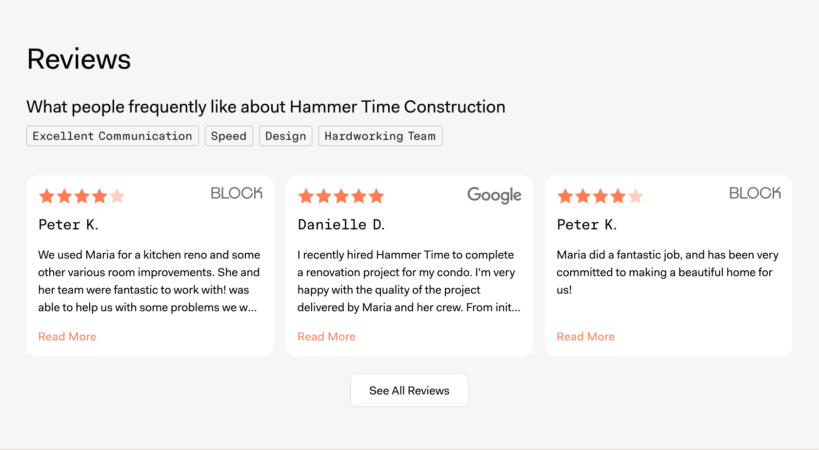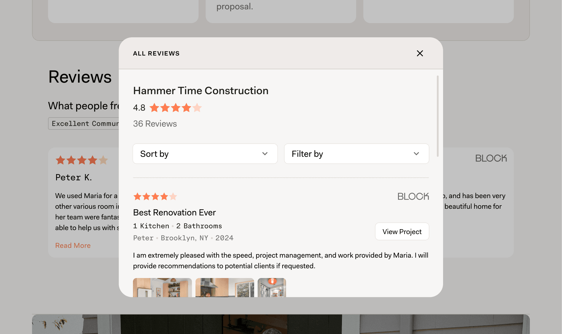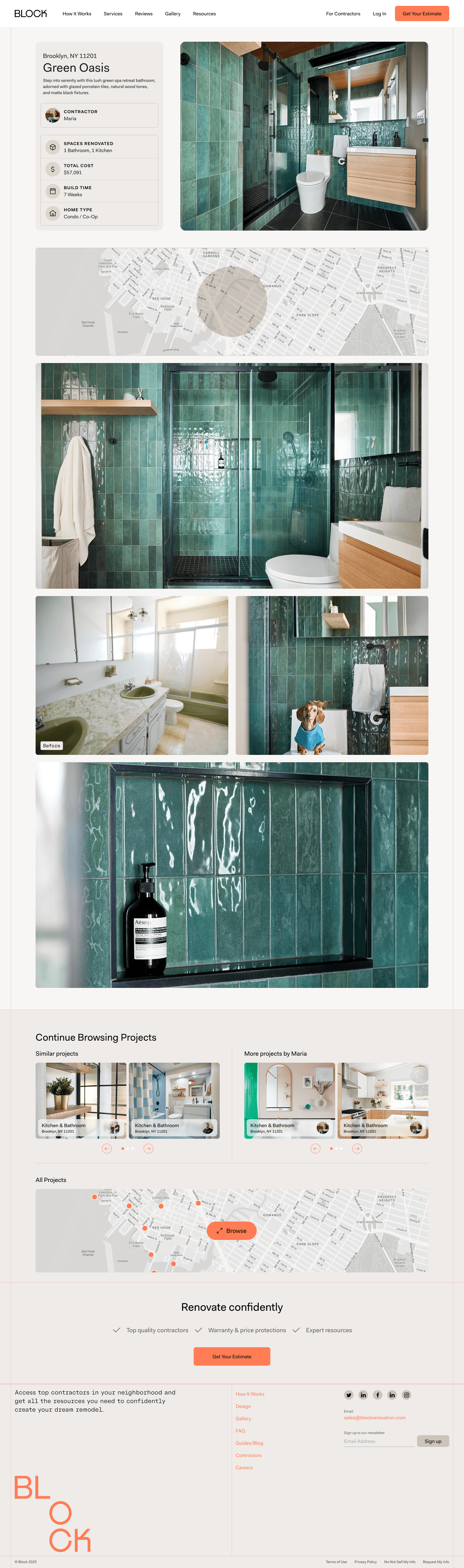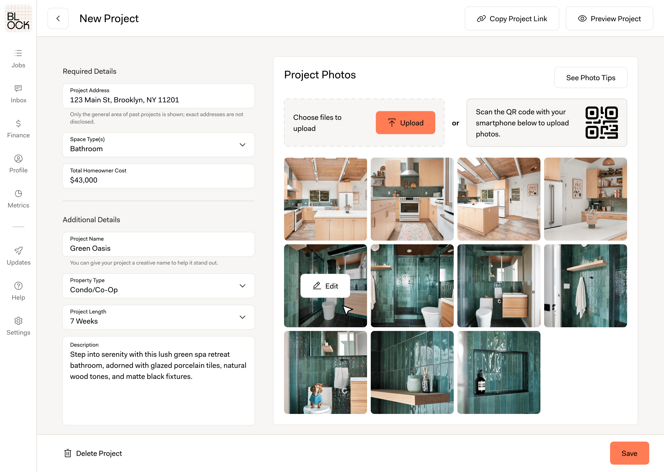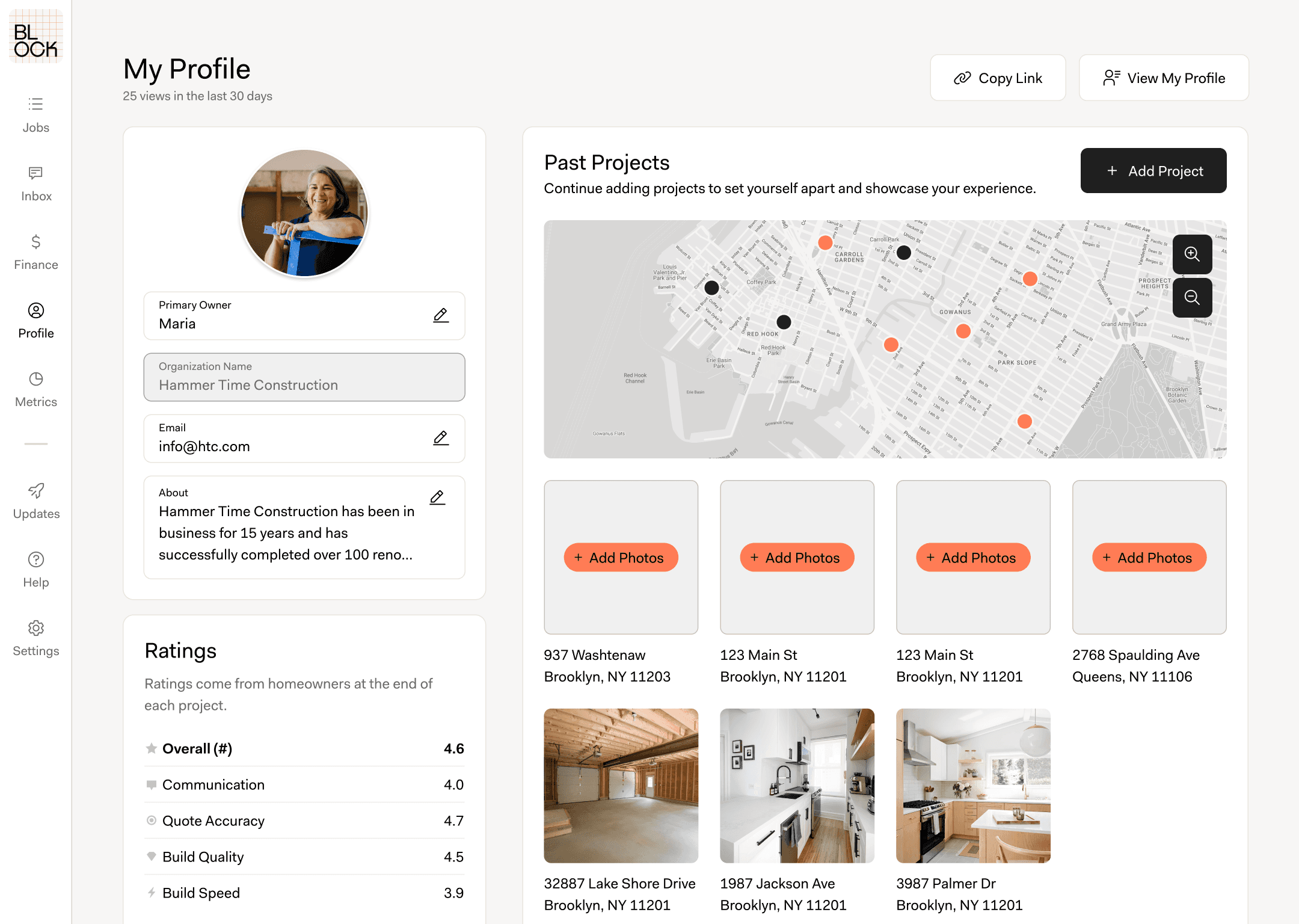 Contractors lacked a way to document past work. We solved this by letting them add projects to their profiles, auto-capturing data from completed Block projects, and creating homeowner-facing project pages.